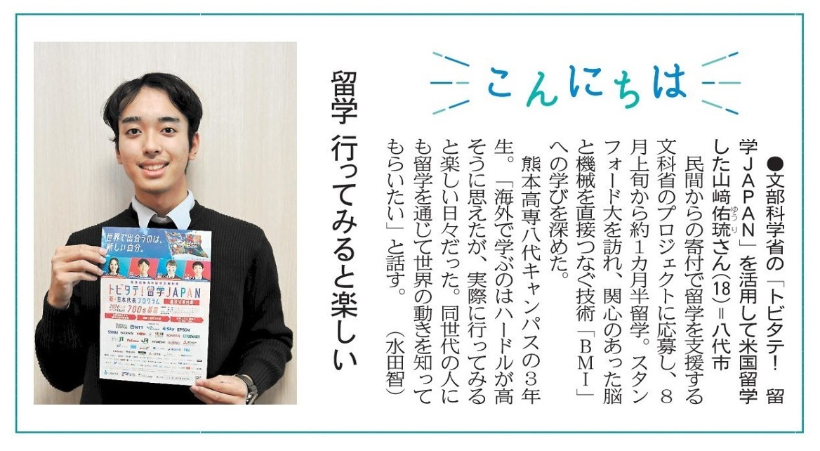 令和8年2月3日(火)、熊本日日新聞に、機械知能システム工学科3年 山﨑 佑琉さんのアメリカ留学に関する記事が掲載されました。