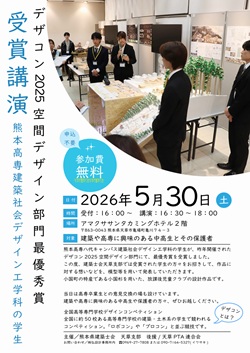 令和8年5月30日(土)、熊本県建築士会天草支部主催の「デザコン2025空間デザイン部門最優秀賞 受賞講演」が開催されます。「デザコン2025 in 福井」空間デザイン部門にて最優秀賞を受賞したチームの学生が講演します。ご興味のある方は、ぜひお越しください。