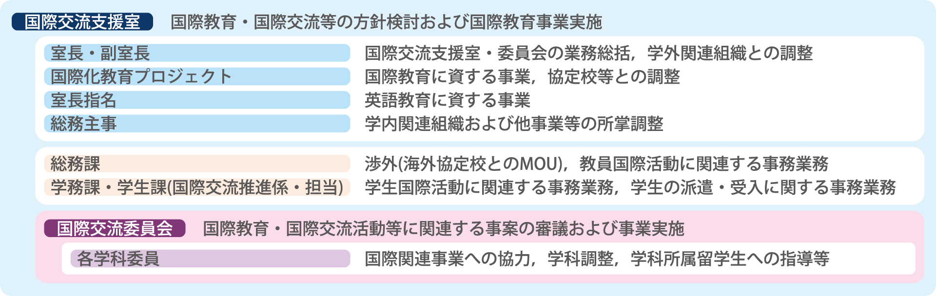 国際交流支援室および国際交流委員会では、海外の教育研究機関との交流協定の締結、教職員および学生の派遣・受入れ、国際交流プログラムの企画・運営、留学生への支援などを通じて、学内の国際化を推進しています。また、海外研修や国際インターンシップ、国際イベントへの参加を通じて、学生が国際的な視野と協調性を身につけられるよう、積極的な支援を行っています。