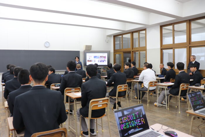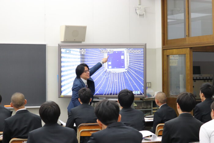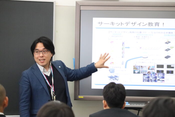令和7年11月17日(月)COMPASS5.0半導体分野プロジェクト実践校の石川洋平教授(有明工業高等専門学校)は、佐賀県立有田工業高校 電気科2年生と教職員合わせて約45名を対象に「半導体・集積回路出前講座」~有明高専発サーキットデザイン教育~をテーマに講演を行いました。