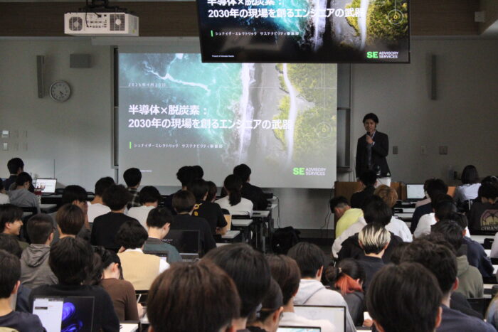 講義では、『半導体×脱炭素』をテーマに講義をいただくとともに、グローバルに展開する半導体製造会社や国内外の大手半導体設備メーカーに対して、再生可能エネルギーの調達支援や省エネ診断を含む脱炭素の総合支援を展開する同社の知見を基に、最新の業界動向についても解説いただきました。