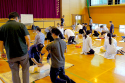 この訓練は、心肺停止等の緊急事態が発生した場合に適切に対処できるよう、知識と実技を習得することを目的としています。教職員は原則3年ごとに受講することとなっており、今年度は32名が参加しました。