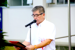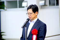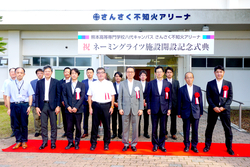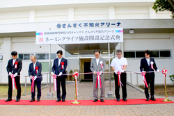 その後、テープカットと記念写真撮影を実施し、本校の田中 禎一副校長が謝辞を述べ、正式に「さんさく不知火アリーナ」のスタートを切りました。式典には、本校機械電気工学科及び専攻科卒業生(現、株式会社三井三池製作所社員)5名も参加いただきました。