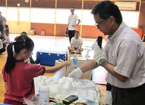 前半では、氷の温度を測定した後に、氷が水に浮く理由について学習するために、水分子と氷の結晶構造を人の動きで再現しました。参加者全員が体育館で手をつなぎ、氷になるときに分子の間にすき間ができて広がるという様子を体感することで、密度が下がって水に浮くという仕組みを学びました。その後、氷の性質を活かしてゼリー作りを行いました。児童たちはジュースやカルピスなど好きな飲み物を選び、ゼラチンと混ぜて氷で冷やすことでゼリーを完成させていました。