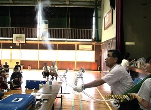 令和7年9月7日(日)、上土井幸喜嘱託教授が人吉市立人吉東小学校にて、1年生40名を対象に「つめたいせかいをたいけんしよう!」というテーマで出前授業を実施しました。授業は「こおりのせかい」と「ドライアイスのせかい」の2部構成で行われ、人吉東小学校の小学1年生40名に加え、保護者や兄弟姉妹を含む約120名が参加しました。