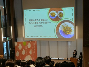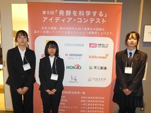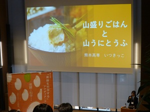 令和7年11月12日(水)、新潟県長岡市で開催された「発酵を科学する」アイディア・ライブラリー審査会に、生物化学システム工学科2・4年生の2チーム計3名が出場しました。今回のコンテストは『日本のおコメにあう、愛すべき郷土の発酵おかず』というテーマのもと、全国から11⾼専23チームが参加しました。4年生チームは「もろみ香るたかな漬」2年生チーム(1名で参加)は「山盛りごはんと山うにとうふ」を愛すべき郷土の発酵おかずとして選出し、ショートプレゼンや実食付きの交流セッションで紹介しました。会場の試食コーナーでも多くの参加者が興味を持って試食していました。残念ながら受賞は逃しましたが、地元熊本の発酵食品の良さをアピール、紹介する良い機会となりました。