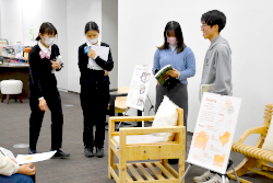 学生たちは4グループに分かれ、10月から、実際に利用可能な原寸大の椅子を製作してきました。講評会では、実際に椅子に座ったうえで、「欲しい」「座りやすい」といった感想、また具体的に改善すべき点のご指摘もいただきました。建築を学ぶ学生にとって、図面を描く段階からユーザーをイメージすること、実物をどのように作るかを想定しておくことの重要性を認識する、よい機会となりました。