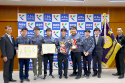 令和8年1月22日(木)、「アイデア対決・全国高等専門学校ロボットコンテスト2025全国大会」においてロボコン大賞および準優勝を受賞した、熊本キャンパスロボコン部の学生6名と指導教員2名が、合志市長を表敬訪問しました。